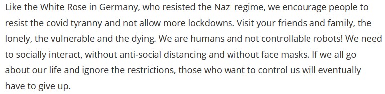 Die Gruppe bezeichnet sich selbst „als eine Fortsetzung der Weißen Rose“. Für die Mitglieder erscheint das passend: Sie beschreiben „bemerkenswerte Parallelen“ zwischen sich selbst und der Widerstandsgruppe gegen den Nationalsozialismus. Denn sie meinen, dass derzeit ein “stiller Genozid“ stattfinde – durch Lockdowns und die Impfungen. Auf der Website ermutigt die Gruppe ihre Anhänger*innen, Flugblätter von der Website herunterzuladen, auszudrucken und zu verteilen, um damit dem Aktivismus der Weißen Rose zu folgen.
