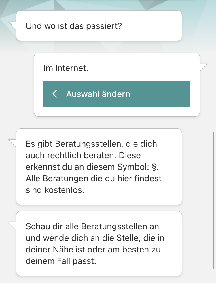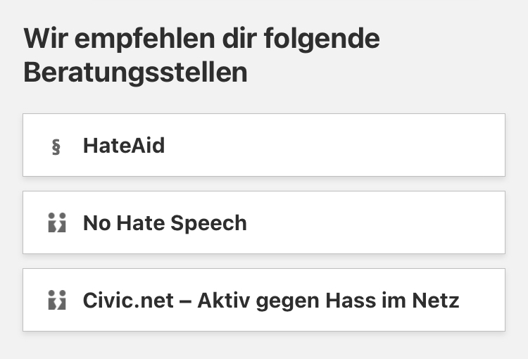 Neben dem breitgefächerten Hilfsangebot überzeugt die App vor allem durch ihre Niedrigschwelligkeit. So bietet sie ihren Nutzer*innen im Berliner Raum jederzeit Überblick über ihre Handlungsoptionen, die Möglichkeit ein Fallprotokoll anzulegen sowie zahlreiche Beratungsangebote je nach Art und Ort der Diskriminerung. Hier kann man wählen zwischen “Behörden”, “Schule und Kita”, “Wohnungssuche”, “Internet und andere Orte” und wird dann zu möglichen Ansprechpartner*innen weitergeleitet. So findet sich beispielsweise unser Projekt Civic.net unter den Beratungsangeboten für Diskriminierungserfahrungen im digitalen Raum.