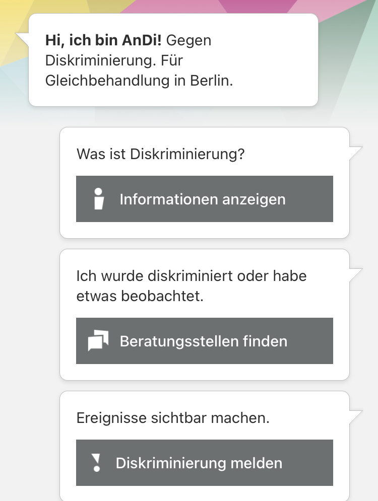 AnDi – die Antidiskriminerungs-App wurde am 28. Oktober auf einer Pressekonferenz von Justizsenator Dirk Behrendt vorgestellt und kann im Google Play Store und Apple (Appstore) kostenfrei heruntergeladen werden. Die App wurde in engem Austausch mit Berliner Projekten und Betroffenen entwickelt. Benutzen lässt sich die App barrierefrei und in 7 Sprachen (Deutsch, Englisch, Französisch, Türkisch, Arabisch, Farsi und Russisch). Bis Ende des Jahres ist die App in acht weiteren Sprachen (Rumänisch, Romanes, Bulgarisch, Vietnamesisch, Chinesisch, Spanisch, Portugiesisch, Hebräisch) bedienbar. Außerdem punktet die App durchihre datenarme Benutzung. Die eigenen Daten müssen nicht angegeben werden bei einer Meldung des Vorfalls. Laut Behrendt diene die App dazu, ein Bewusstsein zu schaffen. Mit diesem Angebot wolle man das Wissen über Diskriminierung erhöhen und verbessern, sagte er bei der Vorstellung.