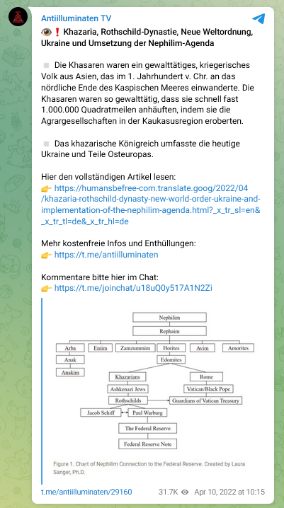Hinzu kommt, dass Heavenly Jerusalem als khazarisches Siedlungsprojekt im aktuellen Krieg in der Ukraine einen hohen Stellenwert vor allem für pro-russische Verschwörungsideolog*innen bekommt. Denn genau diese Akteur*innen versuchen, die russische Invasion und Kriegsverbrechen als heiligen Kampf gegen die Mächte des Bösen, die hier jüdisch codiert werden, zu gestalten.