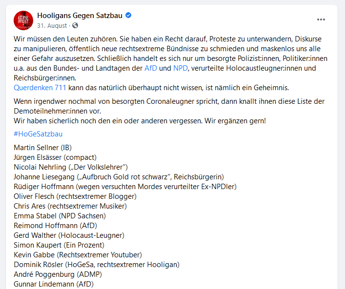 Wer auf die Demonstrationen geht, macht sich mit diesen Menschen gemein. Wer gegen Maßnahmen protestieren möchte, ohne Neonazis und Demokratiefeind*innen zuzustimmen, muss eigene Kundgebungen organisieren.