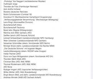 tl;dr: Es sind viele Neonazis und Rechtsextreme dabei. Unter anderem aus rechtsextremen Parteien wie NPD, Die Rechte und Der III. Weg, aus rechtsextremen Netzwerken wie Kameradschaftkreisen und Milizen, rechtsextreme Kampfsportler, rechtsextreme Musiker, Holocaust-Leugner*innen, Reichsbürger*innen und Autor*innen rechtsextremer und rechtsradikaler Medien. Nicht allen sieht man ihre Ideologie an, doch die, denen man die Ideologie nicht ansieht, sind oft noch gefährlicher als die, die offen mit rechtsextremer und antisemitischer Symbolik über die Demonstrationen laufen. Denn sie wollen das antidemokratische Potenzial der „Querdenken“-Demonstrationen strategisch nutzen, um die Demokratie zu zerstören. Dazu kommen noch zahlreiche AfD-Funktionär*innen und -Anhänger*innen.