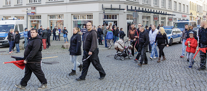Auffällig, aber nicht neu: Das eingesetzten Ordner-Team bestand ausschließlich aus lokalen und Berliner Neonazis um Gesine und Ronny Sch. von der verbotenen Kameradschaft „Frontbann 24“. Anwesend waren auch etliche Partei-Nazis von „Die Rechte“sowie der „Nationaldemokratischen Partei Deutschlands“ (NPD).