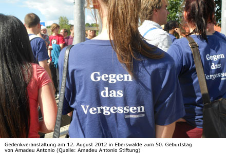 Der Mord an Amadeu Antonio, der zu den ersten Todesopfern rechtsextremer Gewalt nach der Wende gehört, hat Eberswalde geprägt. Der Name der Stadt wurde wie Mölln und Solingen zu einem Synonym für die blutigen Auswirkungen rechtsextremer Gewaltausbrüche. Die Folgen des Mordes für die Stadt sind ambivalent: Zum einen haben sich als Reaktion auf die Tat zivilgesellschaftliche Initiativen gegründet, die durch ihr intensives und fortdauerndes Engagement dafür arbeiten, ein tolerantes und weltoffenes Klima in Eberswalde zu schaffen. Nicht zuletzt wurde die Amadeu Antonio Stiftung ins Leben gerufen, deren Ziel es ist, die Zivilgesellschaft gegen rechtsextreme Alltagskultur zu stärken.