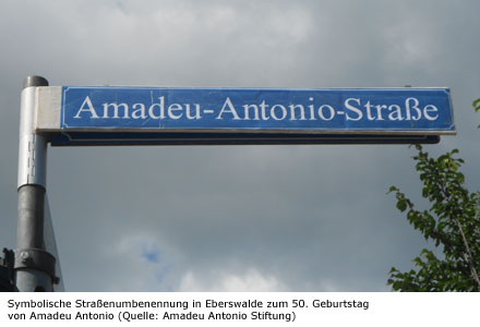 Bislang erinnert eine schlichte Tafel an die Tat. Über die Frage eines würdigen Gedenkens ist ein Streit in der Stadt entbrannt, der bis heute nicht wirklich gelöst wurde. Den Anfang machte die Initiative „Light me Amadeu“, die als Reaktion auf den Mord gegründet wurde. Sie machte im März vergangenen Jahres, unterstützt vom afrikanischen Kulturverein „Palanca“, den Vorschlag, einen Teil der Eberswalder Straße in Amadeu-Antonio-Straße umzubenennen – nämlich genau jenen Abschnitt, auf dem Amadeu Antonio angegriffen wurde. Diesen Vorschlag brachte die Fraktion Bündnis 90/Die Grünen im September 2011 in den Kulturausschuss und die Stadtverordnetenversammlung ein – der Beginn einer Debatte, die schließlich die ganze Stadt ergreifen sollte.