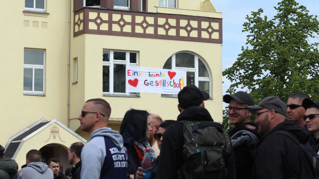Auf den ersten Blick wirkte der Wartburgplatz im Plauener Stadtteil Haselbrunn wie ein Volksfest. Verschiedene Stände in grünen Zelten und Bierzelttische standen am 01. Mai auf dem Platz verteilt. Doch die Veranstaltung war kein Volksfest, sondern die Auftaktkundgebung zur jährlichen Maidemonstration der neonazistischen Partei „Der III. Weg“. An den Ständen informierte die Partei ihre Anhänger*innen über ihre Arbeit, wie beispielsweise die „Arbeitsgruppe Körper und Geist“, die einerseits Kampfsporttraining für Kinder anbietet und deren Mitglieder andererseits selbst an neonazistischen Kampfsportevents wie dem „Kampf der Nibelungen“ oder dem „TIWAZ“ teilnehmen. An weiteren Ständen warb die Kleinstpartei für die Europawahl oder verkaufte Kleidung mit dem Logo des „Dritten Weg“. Auf den Bierbänken saßen die Teilnehmer der späteren Demonstration und lauschten den rassistischen, nationalistischen und antisemitischen Reden vom stellvertretenden Parteivorsitzenden Matthias Fischer oder dem „Gebietsleiter Süd“ Walter Strohmeier. Zudem wurden völkische Tänze vorgeführt und zwei alte Volkslieder gesungen.