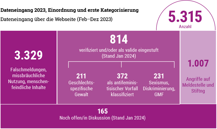 Das Angebot der Meldestelle wurde seit ihrem Start zum 1. Februar 2023 kontinuierlich genutzt. 814 der eingegangenen Meldungen sind als valider Vorfall bzw. verifizierte Betroffenen-Meldung dokumentiert worden. 372 dieser Meldungen wurden als antifeministischer Vorfall eingeordnet. Die anderen Meldungen zeigen ein weites Feld an Vorfällen und Schilderungen von Betroffenen aus dem Bereich geschlechtsspezifische Gewalt auf (211) sowie Vorfälle, die unter der Kategorie Sexismus, Diskriminierung, gruppenbezogene Menschenfeindlichkeit (231) zusammengefasst werden.