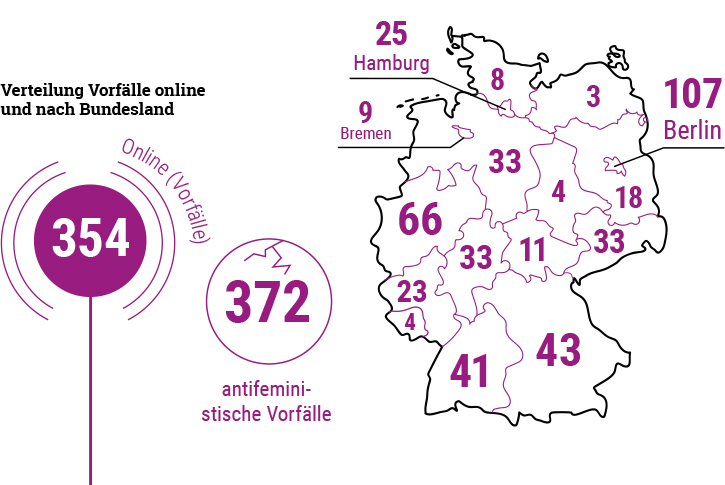 Unter den Fällen sind 12 Meldungen antifeministisch motivierter physischer Gewalt, wie der Angriff auf eine Frau, die ohne Vorwarnung zu Boden gestoßen und als „Lesbenfotze“ beschimpft wird. Unter den 16 erfassten Sachbeschädigungen sind Vorfälle wie ein Brandanschlag auf eine lesbische Fraueninitiative sowie eine Regenbogenflagge auf einem Bahnhofsvorplatz, die durch eine Hakenkreuzflagge ersetzt wurde. 133 Vorfälle von digitaler Gewalt umfassen beispielsweise die namentlich adressierten E-Mails mit frauenfeindlichen Beschimpfungen an Mitarbeiterinnen städtischer Einrichtungen oder Vergewaltigungsandrohungen gegen Klimaaktivistinnen in Online-Kommentaren.
