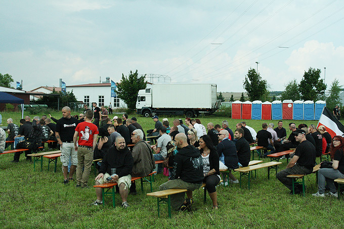 Abgeschirmt feierten hier etwa 800 Neonazis ein „politisches Fest der Nationalen“, angemeldet von Patrick Weber, NPD-Kreistagsmitglied im Kyffhäuserkreis. Journalistinnen und Journalisten sowie „Linken“ und Nazis in „Szenekleidung“ war der Zutritt zum Gelände von den Veranstaltern vorab verboten worden. Diese hatten mit bis zu 1.500 Besucherinnen und Besuchern gerechnet – gerade einmal gut die Hälfte fanden tatsächlich den Weg nach Berga. Dort erwartete sie ein Konzert mit fünf einschlägig bekannten Bands, darunter „Kraftschlag„, den „Kinderzimmer Terroristen“ und „Oidoxie„. Eröffnet wurde das Nazi-Festival vom rechten Liedermacher Frank Rennicke, der laut „taz“ gleich zu Beginn die richtigen Zeilen für das anwesende Publikum fand: „Deutschland, Deutschland über alles, über alles sei geliebt.“