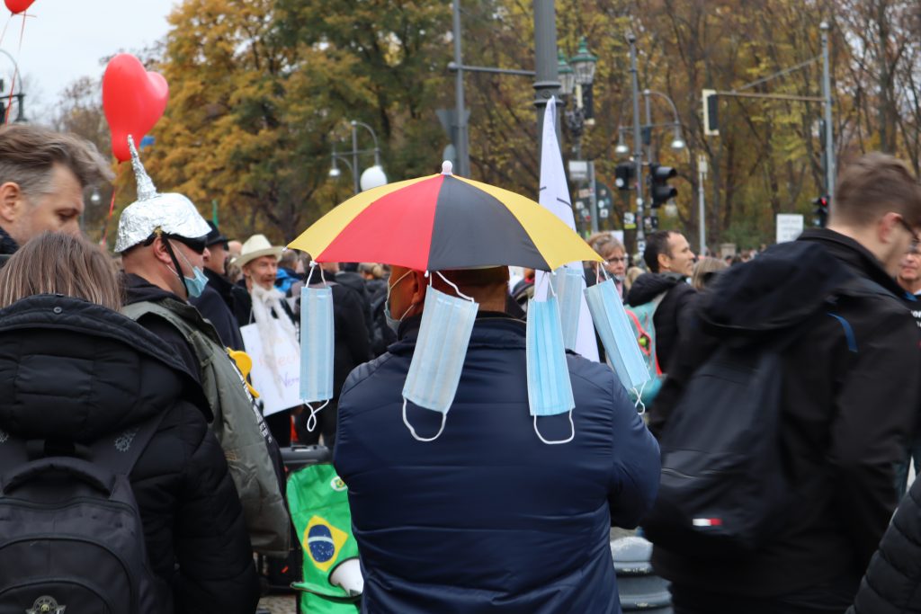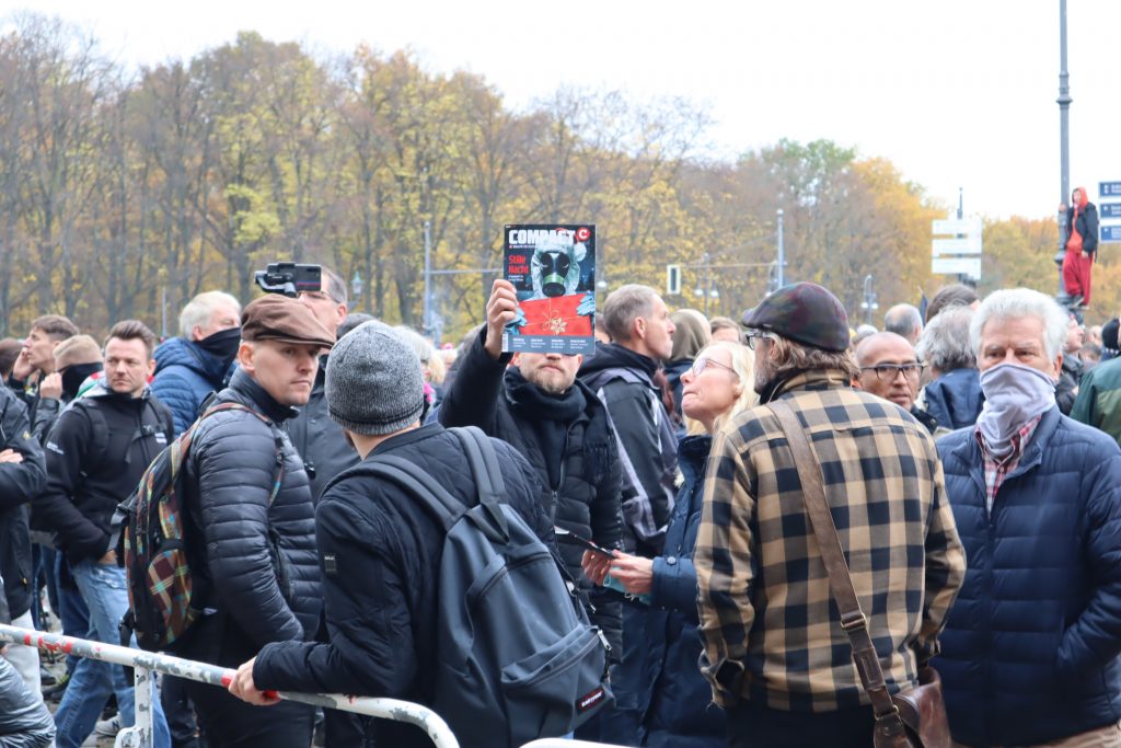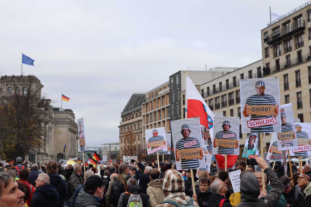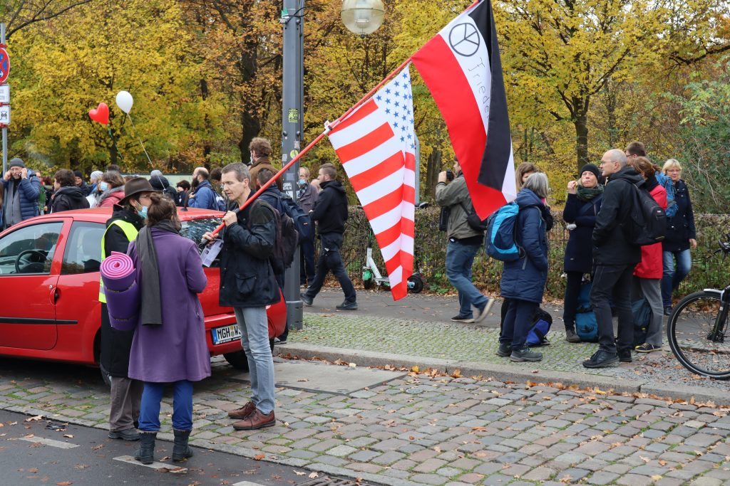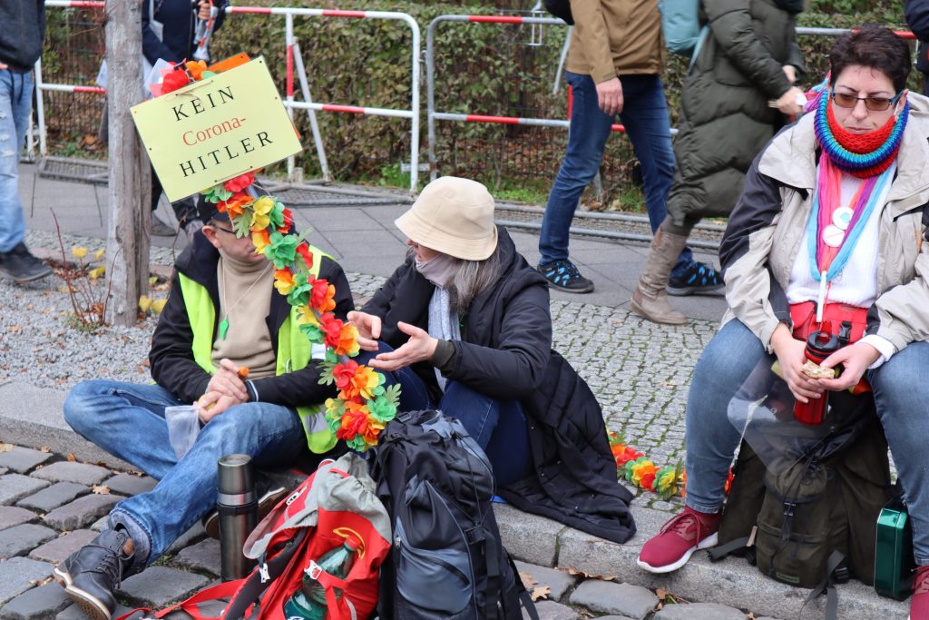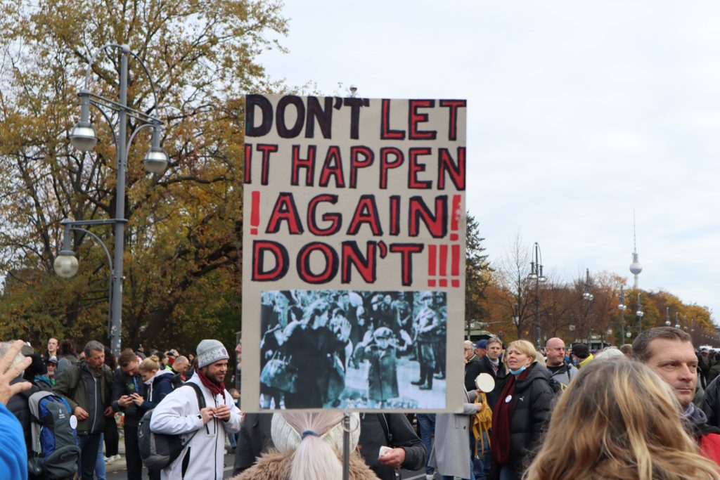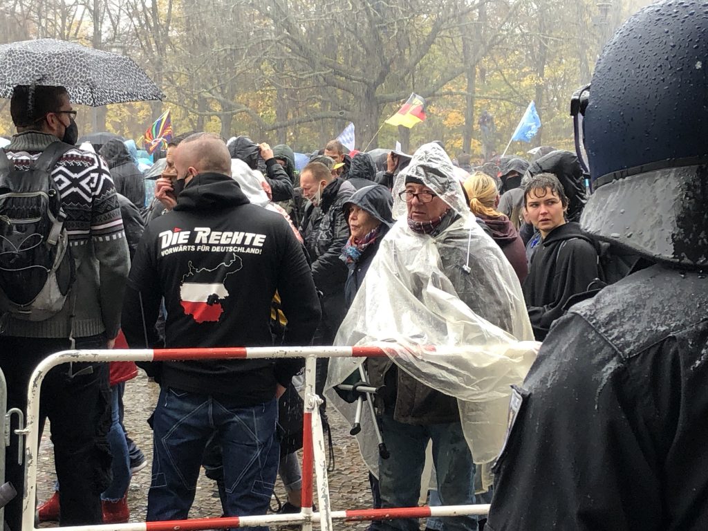 Wenn man den Gesprächen der Demonstrierenden zuhört, Plakate liest oder hört, was in die diversen Mikrofone gesprochen wird, geht es immer wieder darum, dass es keine Rechtsextremen auf der Demo gibt. Immer wieder betonen die Teilnehmenden, dass sie keine Neonazis sehen, keine Reichsbürger und keine Antisemit*innen. Es scheint fast so, als sei diese Annahme einer der zentralen Glaubenssätze der Bewegung.