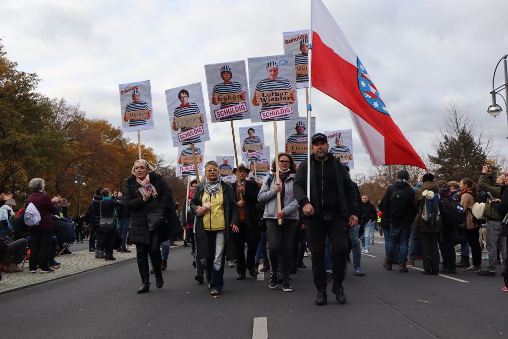 Das führt in der Realität zu skurrilen Szenen. Direkt vor dem Brandenburger Tor hält jemand ein Plakat hoch, auf dem gefragt wird, wo denn all die Rechtsextremen seien, von denen in den Berichten der Medien zu lesen sei. Nur wenige Schritte entfernt begrüßt Nikolai Nerling, ein wegen Volksverhetzung verurteilter, extrem rechter YouTuber gerade Udo Voigt per Handschlag. Voigt war Vorsitzender der NPD und saß bis 2019 für die rechtsextreme Partei im EU-Parlament.