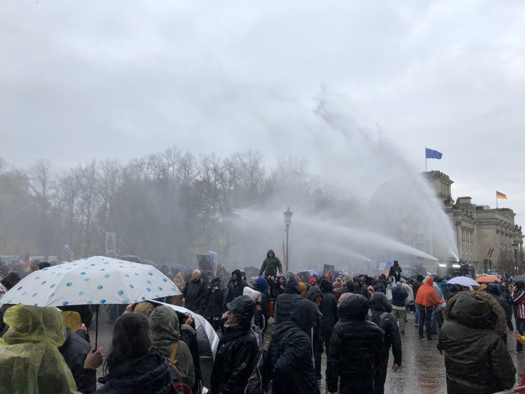 Der Tag beginnt friedlich mit roten Herzluftballons vor dem Brandenburger Tor, endet jedoch mit Dauerregen von Wasserwerfern gegen Coronaleugner*innen, die nicht nach Hause gehen wollen. „Wir sind das Volk!“ und „Frieden, Freiheit, keine Diktatur“ grölt die Menge immer aggressiver, immer hysterischer. Darunter: Rechtsextreme und Verschwörungsideologien jeglicher Couleur. Doch die einschlägigen Reichsflaggen und rechtsextremen Symbole sind dieses Mal weniger prominent, auch wenn Holocaustrelativierung und Geschichtsrevisionismus fast um jede Ecke zu finden sind. Es dauert mehrere Stunden, bis die Polizei den Platz des 18. März vor dem Brandenburger Tor wieder räumen kann. 2200 Beamt*innen sind im Einsatz. Thilo Cablitz, Pressesprecher der Berliner Polizei, spricht von 190 Festnahmen.