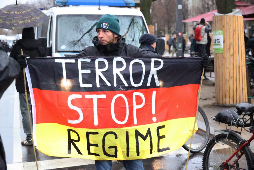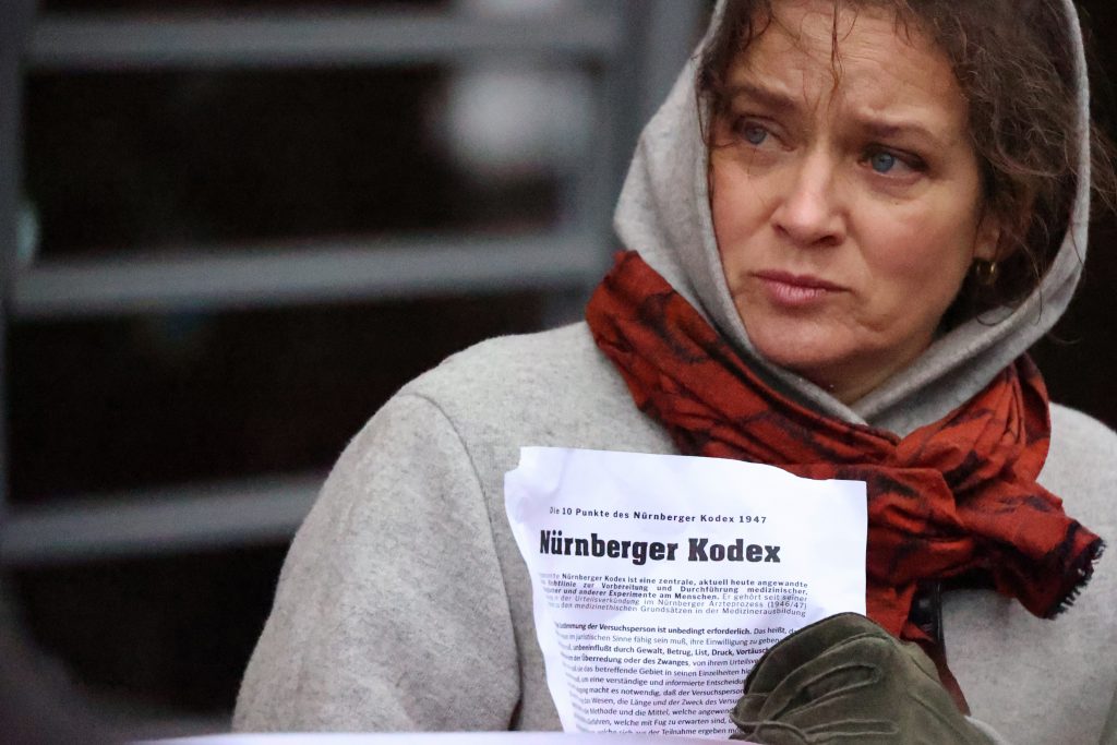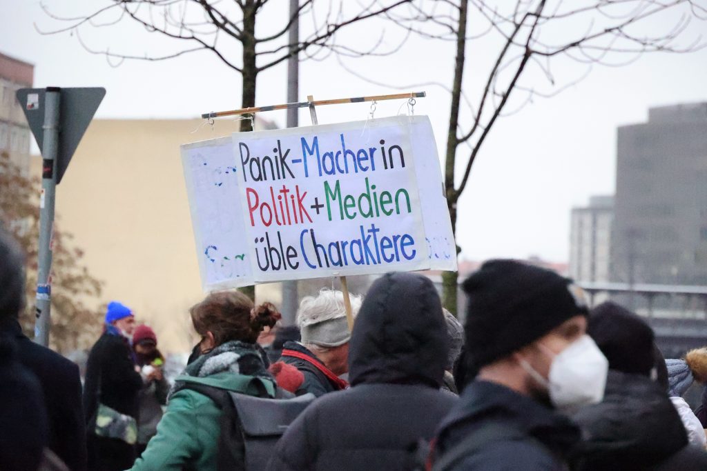 Das Feindbild Medien jedenfalls steht in der Szene: Zunächst versammelten sich rund 150 Pandemieleugner:innen und Impfgegner:innen vor dem ARD-Hauptstadtstudio an der Marschallbrücke. Da die Demonstration dort allerdings nur für 50 Personen angemeldet war und Infektionsschutzmaßnahmen nicht eingehalten wurden, drohte die Polizei kurz nach Beginn um 13:00 mit einer Auflösung. Eine Frau mit einem Schild, das Coronamaßnahmen als „Genozid“ mit einem Zitat einer Holocaustüberlebenden bezeichnete, wurde nach wiederholten Shoah-Relativierungen und Vergleichen ihrer Person mit der NS-Widerstandskämpferin Sophie Scholl von der Polizei abgeführt. Es geht um die frühere Organisatorin von „Querdenken“-Protesten in Berlin, Monica Felgendreher. Nach Belltower.News-Informationen wird nun gegen sie wegen Volksverhetzung ermittelt.
