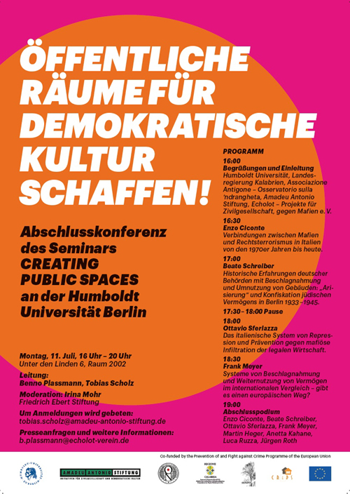 Bei der Prüfung einer Übernahme des italienischen best practice Modells, welche in der EU Richtlinie 2014/42 empfohlen wird, müssen hiesige Erfahrungen eklatanten Missbrauchs bzw. willkürlichen Einsatzes staatlicher Beschlagnahmungsbefugnisse bedacht werden. Die Konferenz „Öffentliche Räume für demokratische Kultur schaffen!“ bringt aus diesem Grund renommierte Expert_innen aus den Rechts- und Geschichtswissenschaften in Deutschland und Italien zusammen, um auf einem soliden Fundament aktuelle Gesetzesvorlagen der Bundesregierung zur Umsetzung der EU-Richtlinie zu prüfen.
