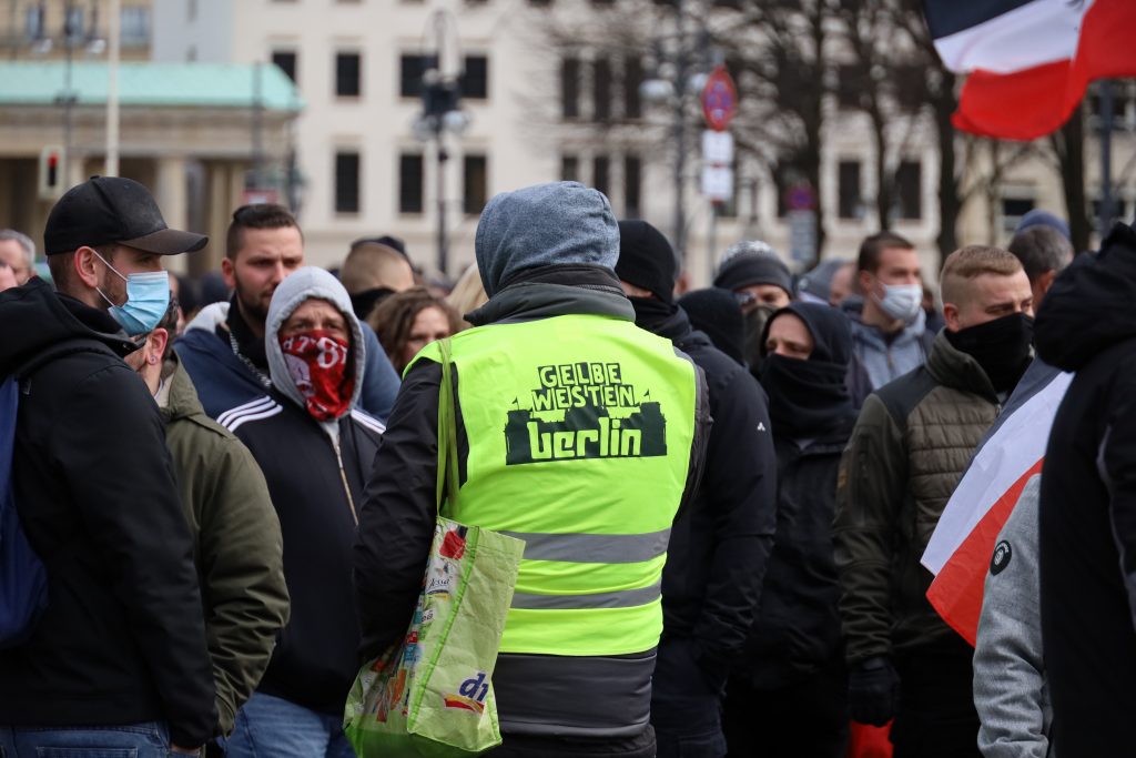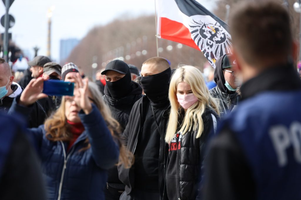 Vereinzelt wurden Journalist*innen bedrängt, beleidigt und bedroht. Viele Teilnehmer*innen trugen schwarz-weiß-rote Kleidung und rechtsextreme Symbolik. Die überwiegende Mehrheit der Demonstrierenden war der rechtsextremen und gewaltbereiten Hooligan-Szene zuzuordnen. Gegen 12:30 Uhr bewegte sich der Demozug entlang der Straße des 17. Juni Richtung Siegessäule, wurde allerdings wiederholt wegen Nicht-Einhaltung der Hygienemaßnahmen und Maskenpflicht von der Polizei aufgehalten. Viele Teilnehmer*innen waren stark alkoholisiert und beleidigten Gegendemonstrant*innen und Journalist*innen entlang der Route. Ein Demonstrant zeigte den Hitlergruß. Immer wieder wurden einzelne Demonstrant*innen von der Polizei abgeführt.