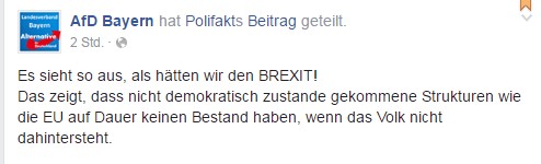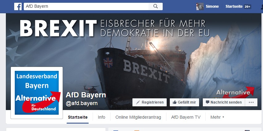 Die AfD Bayern hat sogar schon ein Titelbild dazu gebaut – auch wenn dieser Eisbrecher auch an die Titanic erinnert… Aber die AfD Bayern meint das natürlich positiv und freut sich, dass „nicht demokratisch zustande gekommene Strukturen wie die EU“ keinen Bestand hätten (Argument: Demokratie als undemokratisch darstellen). Weil „das Volk“ nicht dahintersteht (Argument: Völkische Ideologie).