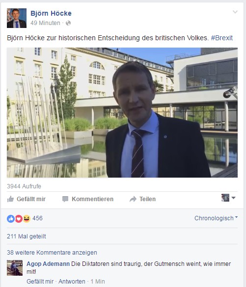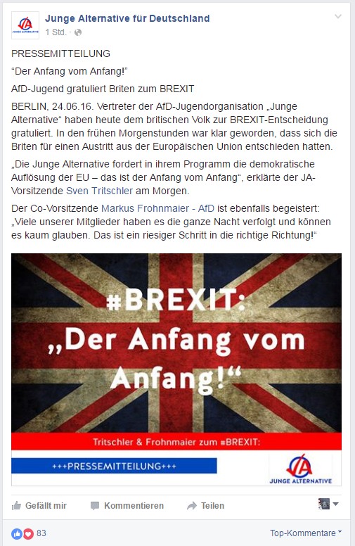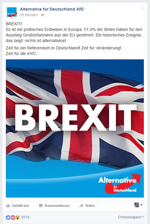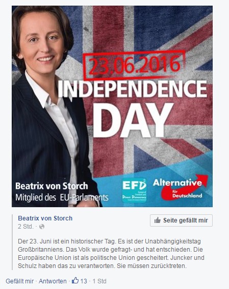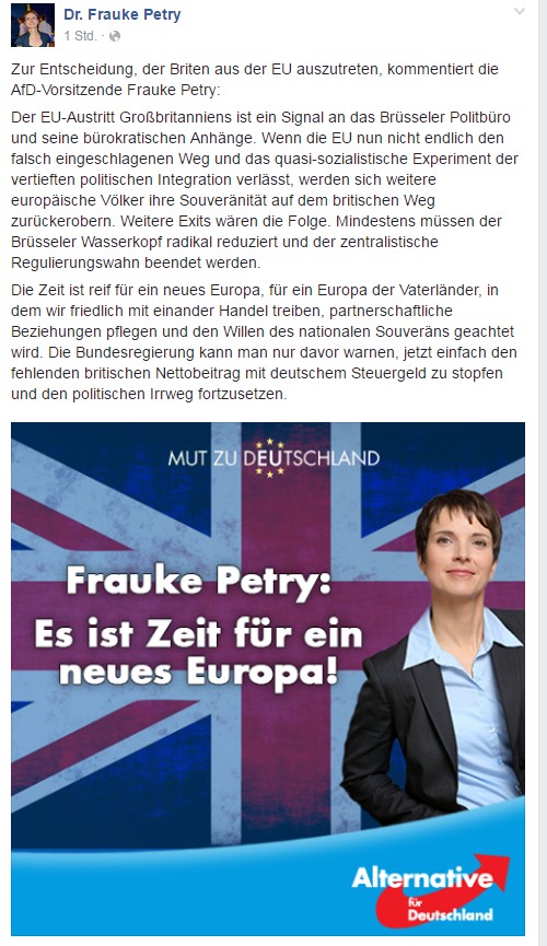 Hier erscheint wieder die EU-Diktatur / Eurokraten-Diktatur.Brexit als „Dominostein“ für den Anfang vom EndeWunschbilder: „Herr im eigenen Haus“ sein und „Ausländerzustrom begrenzen“Ein „Jubeltag“ für die „Anhänger eines Europas (…) freier Völker)“.