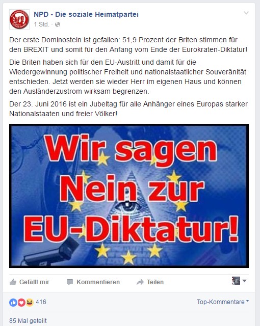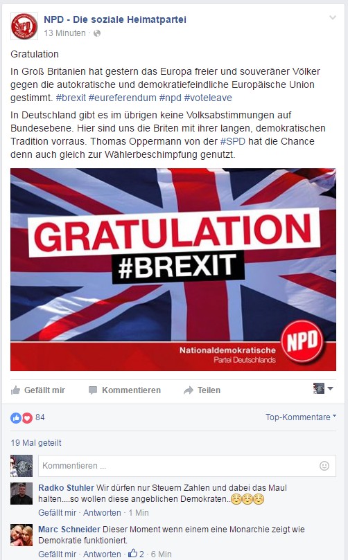 Das „Europa freier und souveräner Völker“ (Ethnopluralismus)EU ist „autokratisch“ (wie viele der NPD-Anhänger_innen verstehen das?) und „demokratiefeindlich“ (ah, wieder Demokratie ist demokratiefeindlich)Maulen über „fehlende“ Volksabstimmungen in DeutschlandSPD-Bashing (natürlich ohne die Leser_innen mit Sachangaben zu belästigen)Und in den Kommentaren das hübsche „eine Monarchie zeigt wie eine Demokratie funktioniert“. Ähem.