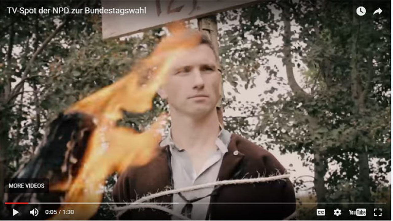NPD-Wahlwerbespot: Was tut man nicht alles für Aufmerksamkeit! Hier: Sich selbst (in Gestalt von Parteivorsitzendem Frank Franz) auf einen Scheiterhaufen stellen. NPD-Wähler als tumbes Bauernvolk darstellen, das kaum Zweiwortsätze von sich geben kann und Richter mit Gemüse vom Hof prügeln. Wenn die Botschaft sein soll, dass die NPD Politik wie aus dem Mittelalter macht und eher von Menschen ohne Denkvermögen gewählt wird, ist der Spot gelungen. Weil nicht-deutsche Wörter bei Rechtsextremen sehr böse sind, bekommen Kinder an NPD-Wahlkampfstellen NPD-„Fingerkreisel“ statt Fidget Spinner (Claim: „Durchdrehen für Deutschland“). Dass die Eltern währenddessen NPD- „Perlwein“ statt Sekt trinken können, liegt allerdings nicht daran – das ist schlicht ein andere Produkt (Claim: „Damit es prickelnd bleibt“). Es gibt passend zum Wahlkampfbeginn eine neue NPD-nahe Publikation: „Gegenlicht“, verantwortet von Funktionär Arne Schimmer, der auch schon für die 2013 eingestellte Publikation der „Jungen Nationaldemokraten (JN)“ namens „Hier & Jetzt“ zuständig war. „Gegenlicht“ bezeichnet sich selbst als „rechtsintellektuell“ und enthält entsprechend viel schwülstigen Text. Kostprobe? „In den virtuellen Redaktionsräumen der „Gegenlicht“ treffen also Nationalrevolutionäre auf radikalisierte Konservative, schreiben jugendliche Schwarmgeister neben desillusionierten Skeptikern, finden hochgespannte Hoffnungen neben nüchternem Pragmatismus ihren Platz.“ Platz ja, aber Leser_innen