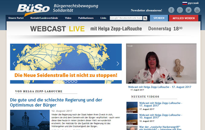 Es gibt wöchentliche Webcasts mit Helga Zepp-LaRouche. In technisch mäßiger Qualität kann man der BüSo-Bundesvorsitzenden zuhören und -sehen, wie sie etwa Trump verteidigt und weiß, dass die Gegendemonstrant_innen in Charlottesville von George Soros finanziert wurden (eine weitere klassische antisemitische Verschwörungserzählung) und außerdem vom FBI geleitet wurden als „Gang / Countergang“-Operation, um Trump zu diskreditieren und ihm Rassismus zu unterstellen. Warum? Damit Trumps Präsidentschaft beendet würde, damit sich Trump nicht dem Paradigma von Chinas Neuer Seidenstraße anschließe, welches ja die „LaRouche“-Bewegung erdacht hat. Zum Glück erhält dieses Werbemittel keine Aufmerksamkeit.