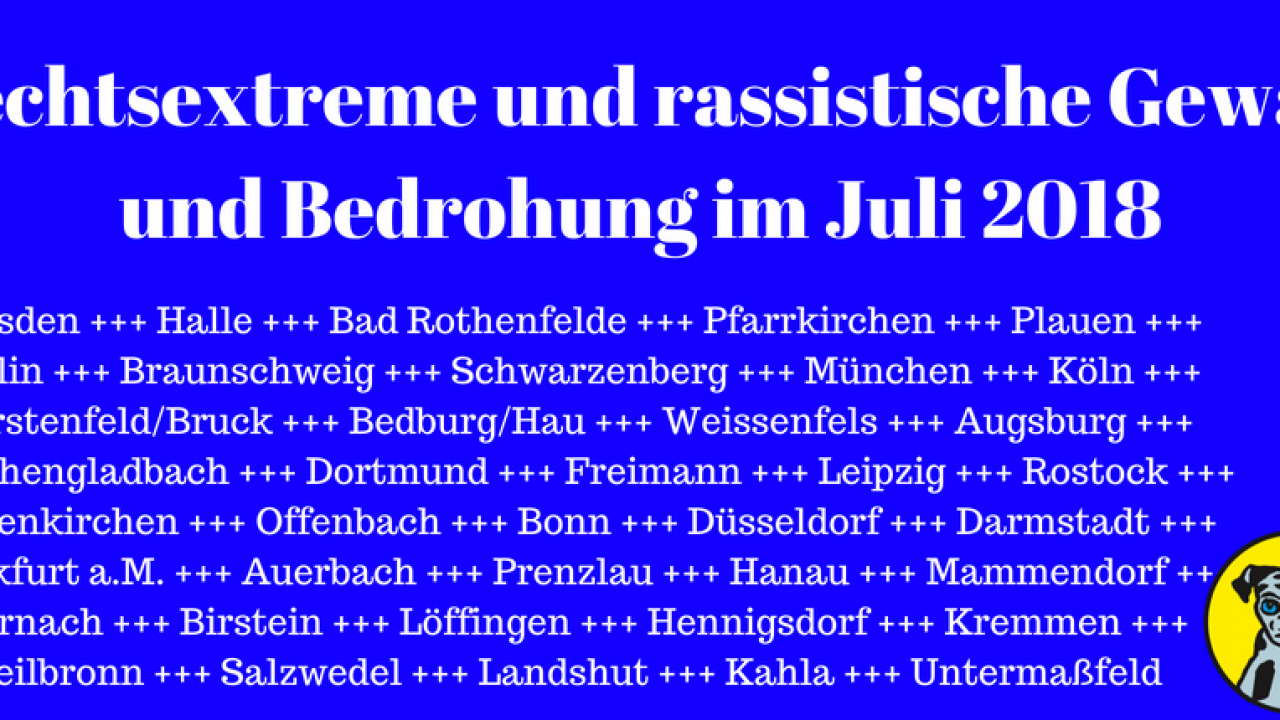 Zur Illustration der Lage in Deutschland stellen wir monatlich rechtsextreme, rassistische und antisemitische Gewalttaten bundesweit zusammen, die in unserer Presseschau vorkommen – diese Chronik basiert also auf Zeitungsmeldungen. Die Chronik ist damit absolut unvollständig, soll aber das Ausmaß klarmachen und wichtigste Vorkommnisse enthalten.