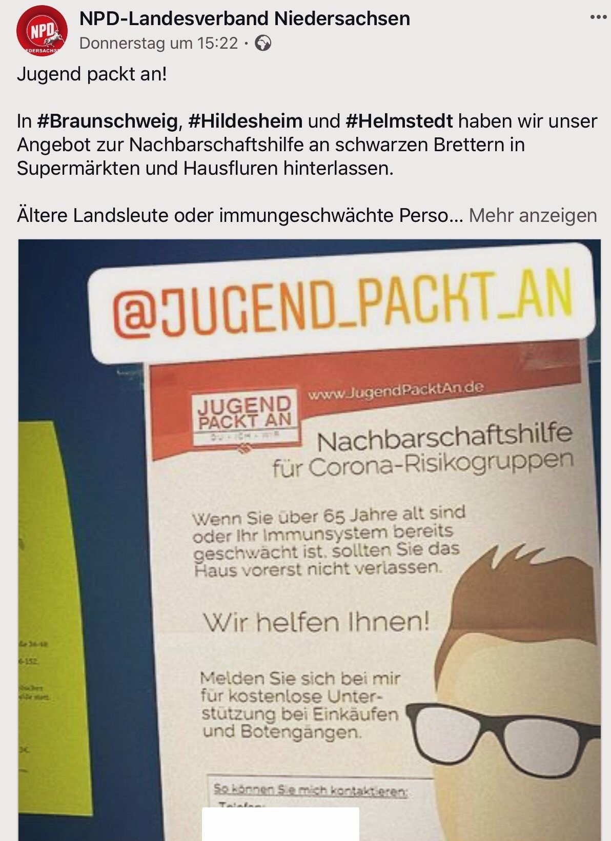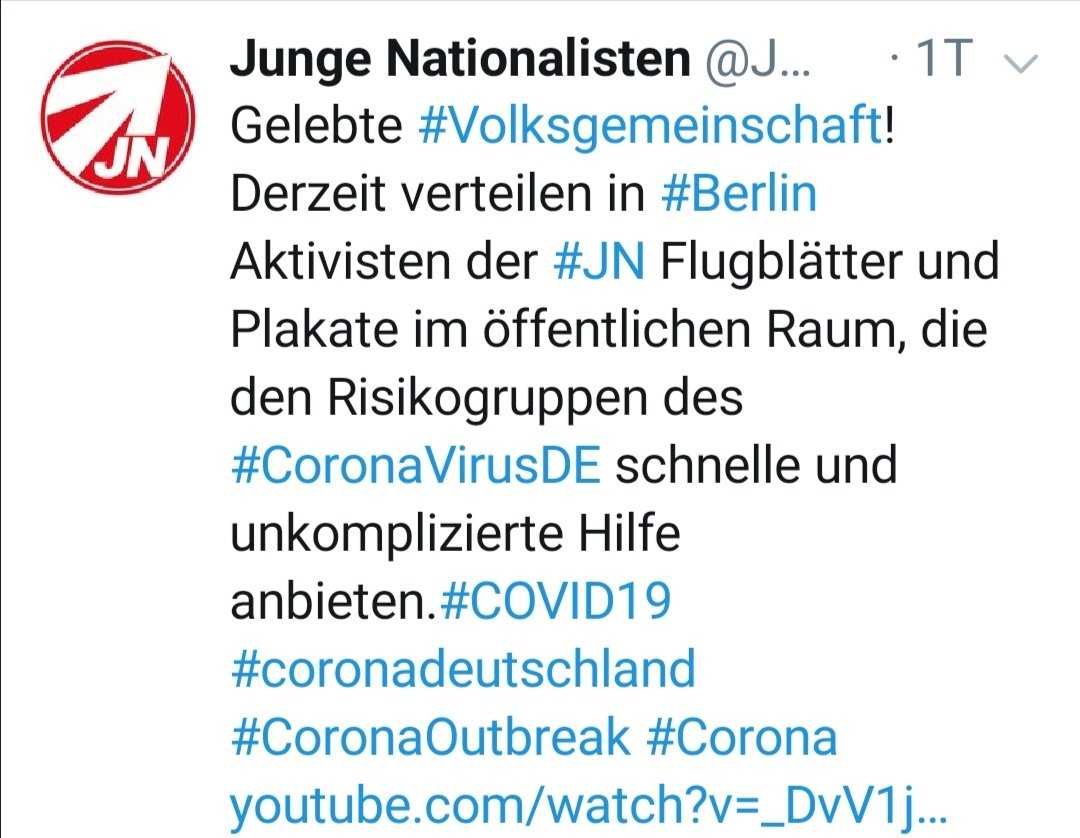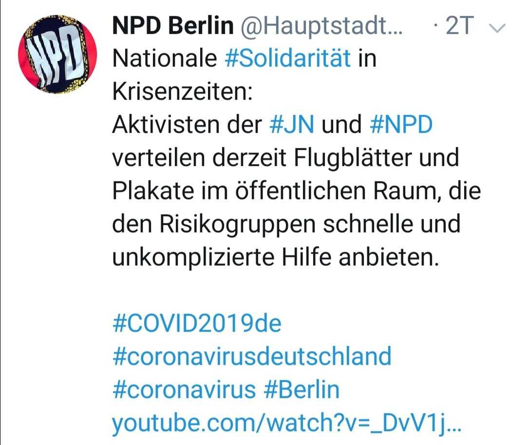 So kündigte etwa die NPD in Berlin auf Twitter an, dass sie mit ihrer Jugendorganisation, den „Jungen Nationaldemokrat*innen (JN)“ Flugblätter verteile, mit denen sie anbieten wolle, zu helfen. Das nennt sich „Nationale Solidarität“.