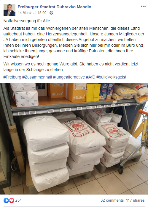 Auch die AfD möchte nun doch auch helfen. Etwa AfD-Rechtsaußen Dubravko Mandic, der auf Facebook ein Hilfsangebot der „Jungen Alternative“ bewirbt. Wobei die Ankündigung: „Ich schicke Ihnen junge, gesunde und kräftige Patrioten“ paternalistisch klingt, und Fragen aufwirft angesichts eines Virus, das eine länger Inkubationszeit hat, bevor es zu erkennen ist. „Wir wissen wo es noch genug Ware gibt“ klingt dagegen absurd verschwörungstheoretisch. Am Ende noch eine völkische Anspielung und absurdem Denglisch: „#buildVolksgeist“. Benutzt übrigens keiner außer Mandic. Was dagegen fehlt: Ein Link zur Aktion der „Jungen Alternative“. Kein Wunder: Weder auf Webpräsenzen der „Jungen Alternative“ bundesweit noch beim Freiburger Ableger gibt es dazu hinweise. Applaus aus der eigenen Bubble gibt es trotzdem.
