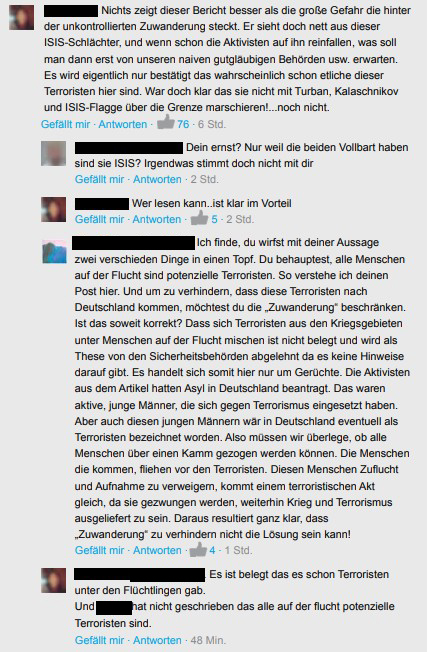 Einige Schreibende äußerten ihre Solidarität mit den mutigen Kämpfer*innen, andere sprachen von der vermeintlichen Gefahr, dass sich einzelne Kämpfer*innen der selbsternannten Gotteskrieger*innen unter einreisenden geflüchteten Personen befindenkönnten. In diesem Beispiel äußert sich eine Person über die Gefahr, dass sich Angehörige der selbsternannten Gotteskrieger*innen (Bezeichnung von Muslim*innen für den sog. »IS«) unter den Personen befinden könnten, die vor eben dieser Gruppierung fliehen.