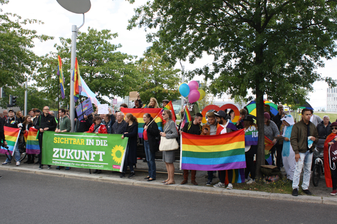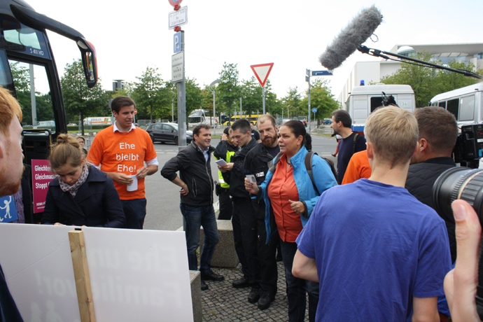 Genau wie in den neun anderen deutschen Städten, wurde der von Gegnern so bezeichnete “Bus der Schande” auch in Berlin von lautstarken Gegenprotesten empfangen. Etwa 200 Menschen hatten sich mit Regenbogenfahnen und Transparenten eingefunden. Zur Gegendemo hatten zahlreiche Berliner Verbände und Parteien aufgerufen, unter anderem das Aktionsbündnis gegen Homophobie, die Berliner Aids-Hilfe e.V., die Veranstalter des CSD, die AktivistenGruppe “Enough is Enough”, der LSVD, die FDP Schöneberg und die LGBT*-Vertreter von SPD und den Grünen und die Ibn Rushd Goethe Moschee.
