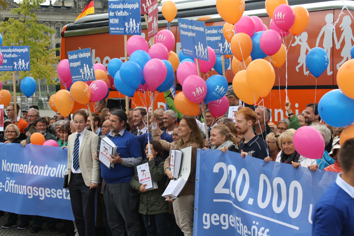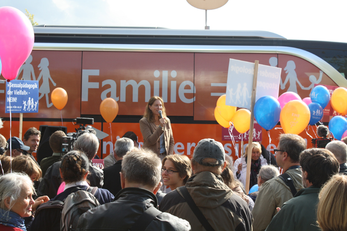 Organisiert wird die Bewegung von der katholischen Aktivistin Hedwig von Beverfoerde. Angelehnt an die französischen Proteste gegen die Eheöffnung für homosexuelle Paare, hatte sie in Stuttgart die „Demo für Alle“ mitangestoßen, um den 2013 angekündigten Bildungsplan zu verhindern. Laut dem Plan sollten baden-württembergische Schulkinder erfahren, dass es homo- und transsexuelle Menschen gibt und sie dann auch zu allem Überfluss akzeptieren. Inakzeptabel für die katholische Landadlige.