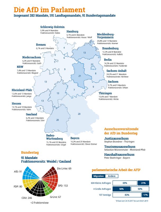 Die AfD im Bundestag: Die AfD zog nach der Wahl am 24.9.2017 zum ersten Mal in den Deutschen Bundestag ein. Mit 12,6 % der gültigen Stimmen ist sie die stärkste Oppositionspartei des 19. Bundestages. Den Vorsitz der Bundestagsfraktion teilen sich Alexander Gauland und Alice Weidel. Unmittelbar nach der Bundestagswahl erklärte Gauland vor laufenden Kameras, die AfD würde sich „unser Volk zurückholen“; und gab damit einen Vorgeschmack auf die Ideologie, mit der die AfD die parlamentarische Auseinandersetzung vergiften würde.