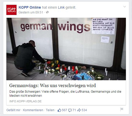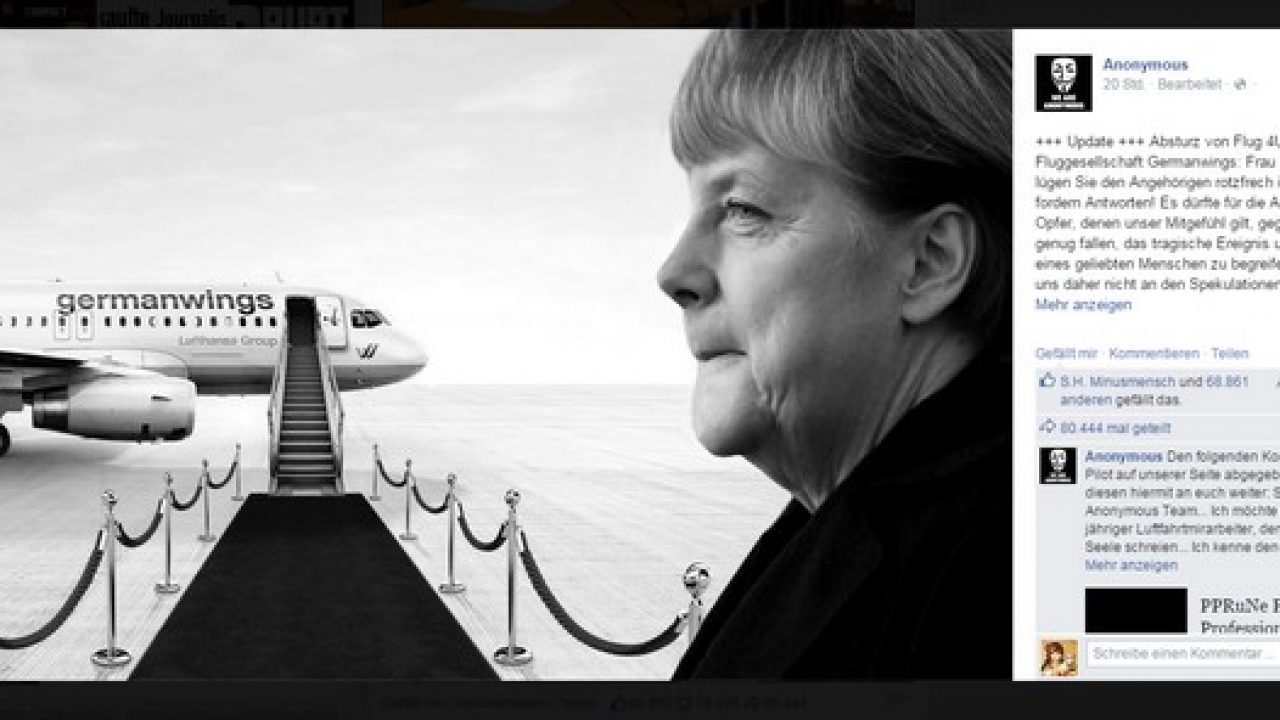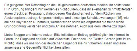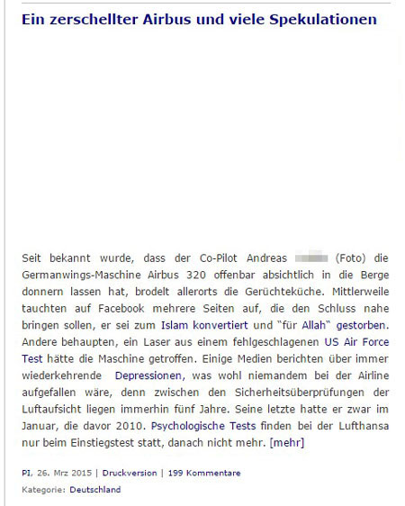 Es war nämlich gar nicht der Copilot. Dem gibt „man“ nur die Schuld, weil er sich nicht mehr wehren kann. Wer es dann war? Zunächst wird lang und breit Udo Ulfkottes Artikel bei „Kopp Online“ zitiert („Lügenpresse“, „giftige Gase“)- die Verschwörungswelt reproduziert sich selbst – , doch in den letzten zwei Absätzen schafft „Anonymous“ noch eine eigene Nuance: Beim Absturz werde ein „Propagandakrieg gegen Russland“ ausgetragen (bisher nirgendwo als auf Verschwörer-Portal-Erwähnungen, aber gut), und dafür will „Anonymous“ Medienseiten „aus dem Internet tilgen“. Und wichtig natürlich der letzte Absatz: Alle sollen die hanebüchenen Theorie teilen: „Gerade jetzt ist es wichtig, dass wir uns von der deutsche Lügenpresse nicht beirren lassen und eine angemessene Gegenöffentlichkeit herstellen.“