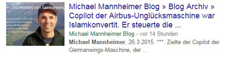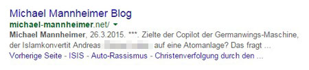 Ein beliebter Blogger in rechtspopulistischen, islamfeindlichen Kreisen ist „Michael Mannheimer“. „Leider“ ist sein Blog aktuell nicht erreichbar, denn die noch sichtbaren Google-Vorschauen sind schon verheißungsvoll: