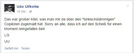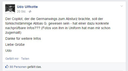 Der bekannte Verschwörungstheoretiker Udo Ulfkotte dagegen wusste schon mehr über den Co-Piloten, der das Flugzeug nach aktueller Nachrichtenlage zum Absturz gebracht haben soll, und verkündete über sein Facebook-Profil: