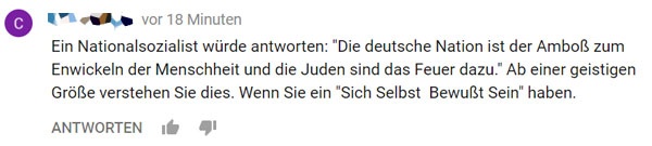 Auch Martin Sellner kommentiert die antisemitische Reaktion auf das Interview. Er wehrt sich allerdings gegen eine antisemitische Interpretation des „großen Austauschen“, das sei „einfach zu billig“, erklärt er in einem Kommentar unter seinem Youtube-Video. Um die rechte Diskussion mehrheitsfähig zu machen, sind die Hauptakteure der Neuen Rechten mittlerweile sehr darauf bedacht, nicht offen antisemitisch zu wirken.