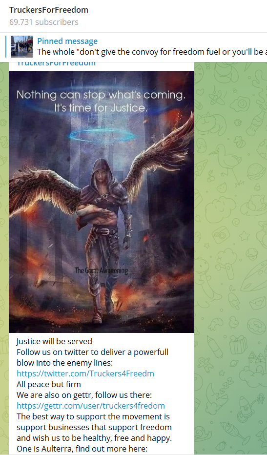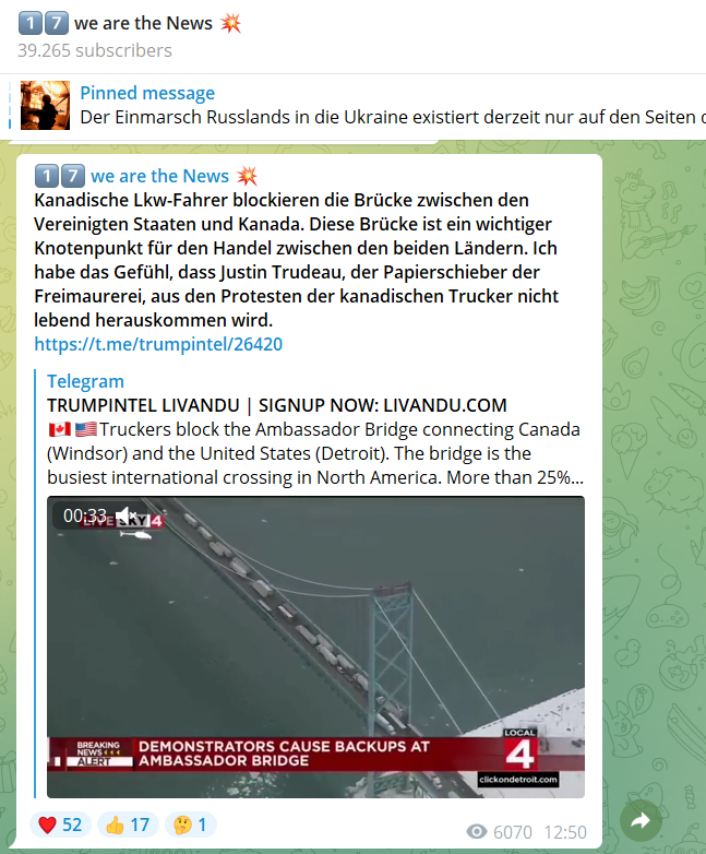 Organisiert werden die Konvois maßgeblich über die Nachrichtenplattform Telegram. Die internationale Gruppe „Truckers for Freedom“ verzeichnet seit ihrem Entstehen Ende Januar bereits 83.000 Mitglieder, die kanadischen Ableger „Freedom Convoy Canada“ und „Canadian Convoy Movement“, als auch die Supportgruppe „Truckers are Hoeroes“ haben zwischen 2500 und 3000 Abonnent:innen. Eine weiteres relevantes Portal für die Bewegung ist der rechtsradikale Twitter-Klon Gettr, dort verzeichnet der Account „Truckers4fredom“ (sic) knappe 50.000 Follower:innen.