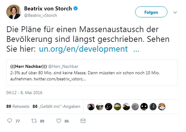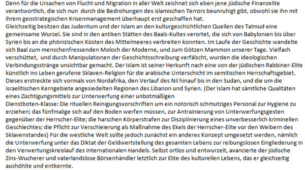Die Hauptakteure der Neuen Rechte sind mittlerweile sehr darauf bedacht, nicht offen antisemitisch zu wirken. In einer Lesermail, die uns vor einigen Wochen erreichte, wird der Antisemitismus hinter der Theorie der „Umvolkung“ deutlicher: „Denn für die Ursachen von Flucht und Migration in aller Welt zeichnet sich eben jene jüdische Finanzelite verantwortlich.“ In der merkwürdigen Welt des Autos ist der Islam eine Erfindung des Judentums, um sich ein Sklavenvolk zu halten, dass nun nach Europa geschickt wird, um die hiesige Kultur zu zerstören.