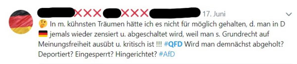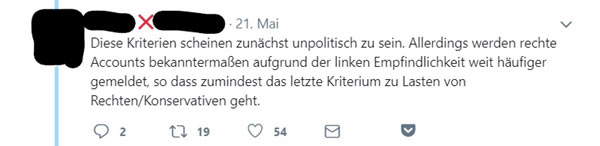 Eine Erklärung findet man dann doch, warum gerade sie, rechtspopulistische und rechtsextreme Accounts, von dem Filter betroffen sind: Es liege nicht etwa an ihrem oft stark beleidigenden Umgangston, für den sie häufiger als andere blockiert werden, sondern an “linken Empfindlichkeiten”: