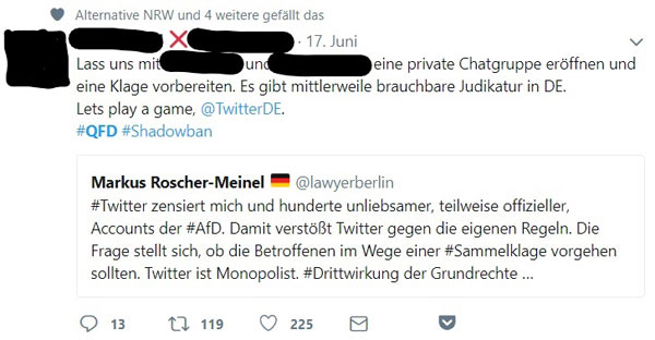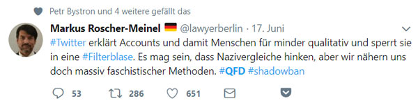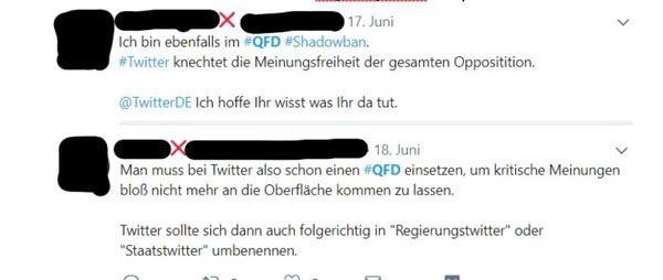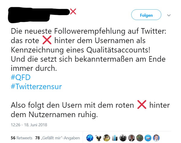 Unter dem Hashtag #QFD (Qualitätsfilter-Diskriminierung) wittert die rechte Twitter-Blase glasklar Zensur. Mit dem Tool “knechtet [Twitter] die Meinungsfreiheit der gesammten Opposition”, und natürlich werde er eingesetzt, um “kritische Meinungen bloß nicht mehr an die Oberfläche kommen zu lassen”. Gar von “Regierungstwitter” ist die Rede.