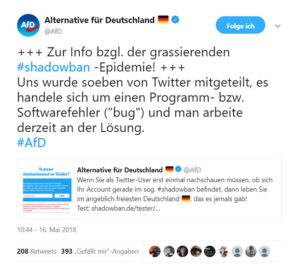 Laut der AfD Seite habe ihnen Twitter mitgeteilt die “#shadowban -Epidemie” sei nur ein Softwarefehler”.