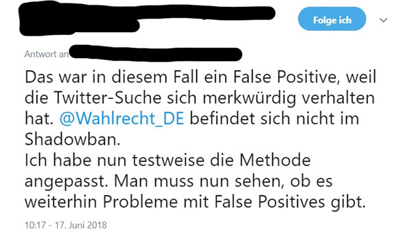Ein Twitter User hat ein Programm geschrieben, mit dem man testen kann, ob man vom Qualitätsfilter betroffen ist. Dieses ist aber noch nicht ganz ausgereift, so markierte es auch den Account @Wahlrecht_de fälschlicherweise als betroffen.