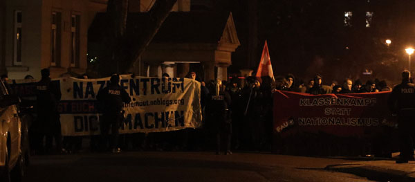 „Nazischweine runter vom Campus“-Rufe und basslastige Musik dröhnen über Kuckhoff-Straße und Steintorcampus der Universität. 100 Nachbarn der „Identitären“ und Aktivisten der Kampagne gegen das extrem rechte Hausprojekt haben sich an beiden Seiten der Straße postiert, wollen die Anreise zum Vortrag behindern. Von 18Uhr an protestieren sie – die Rechtsextremen fotografieren vom Fenster aus die Versammlungen, einige stehen vor der Tür und pöbeln. Direkt neben ihnen haben sich vermummte Einsatzkräfte positioniert – der gewalttätige Angriff auf zwei Polizisten im Dezember ist nicht vergessen, die Ermittlungen in dem Fall laufen noch. Wer an dem Vortrag teilnehmen will, muss an den Kundgebungen und der Polizei vorbei. 19Uhr gehen im ersten Stock des Hausprojekts die Lichter an, der Vortrag zur rechtsextremen Gewerkschaft hat wohl begonnen, und – höchstens 30 Teilnehmer_innen sind gekommen. Entnervt gehen die restlichen „Identitären“ ins Haus, der massive Widerspruch gegen jede ihrer Veranstaltungen scheint Spuren zu hinterlassen. Vor Ort bleiben noch die 50 Polizisten, die Protest und „Identitäre“ trennen. Sie rechnen damit, dass der Abend auch weiterhin friedlich verläuft.