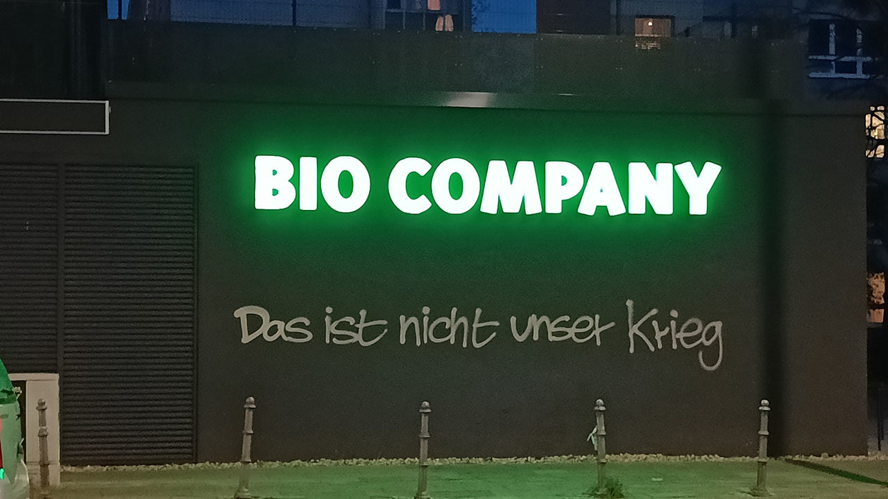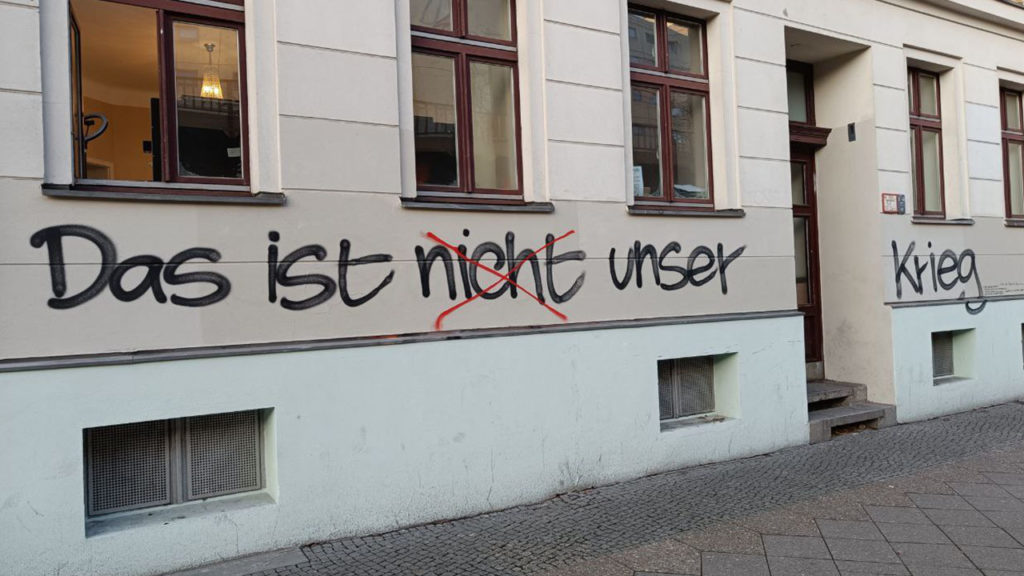 Ende Oktober 2022 tauchten in Berlin die ersten „Nicht unser Krieg“ Graffitis auf. Das Erste, welches ich aktiv wahrgenommen habe, war auf eine Supermarkt-Fassade gesprüht, direkt an einer stark befahrenen Straße in Berlin-Mitte. Anfangs nur vereinzelt, aber zum Jahreswechsel 2023, parallel zur Diskussion um die Panzerlieferungen, tauchten die Parole massenhaft an prominenten Stellen innerhalb der Ringbahn auf.