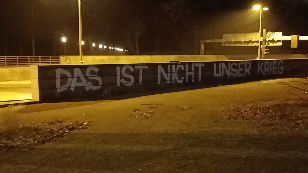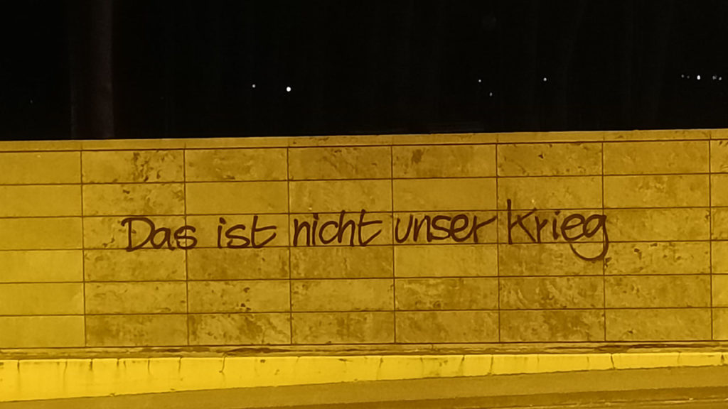 Da ich als junger Erwachsener einige Jahre selber aktiv gesprüht habe, bin ich mir sicher, dass die Urheber*innen der „Nicht unser Krieg“-Graffitis entweder aktive Writer*innen sind oder es einmal waren.