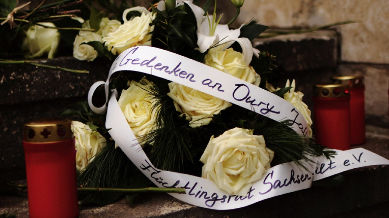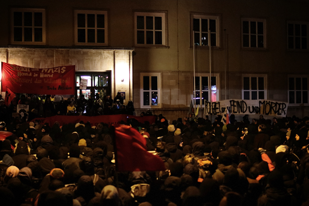 Die Abschlusskundgebung der Demonstration.Die Demonstration, laut Polizei nehmen 3000 Personen teil, läuft über den Dessauer Marktplatz zur Polizeistation, in der Oury Jalloh verbrannte. Manche der Demonstrierenden sind wütend, werfen symbolisch Feuerzeuge gegen die Eingangstür der Polizeistation. Andere legen Blumen nieder, gedenken dem Toten in Stille.