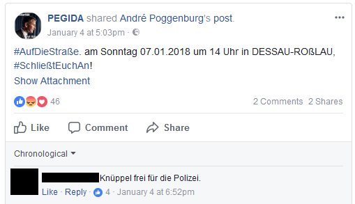 Screenshot der Pegida-FacebookseiteHundert Anhänger der AfD stehen auf den Parkflächen vom August-Bebel-Platz. Dreißig weitere Personen, unter ihnen Dessauer Neo-Nazis, stehen auf der Straße. Sie warten auf die linke Demonstration. Auf der AfD-Kundgebung wird sich am politischen Gegner abgearbeitet, um Oury Jalloh geht es ihnen nicht. Als „verderbliche Krankheit“ werden die Demonstrierenden von André Poggenburg beschimpft. Es ist eine Kundgebung des Hasses gegen einen jungen Mann aus Sierra Leone, der in deutschem Polizeigewahrsam starb. Ein Toter, bei dem mittlerweile ein Staatsanwalt davon ausgeht, dass er ermordet wurde.