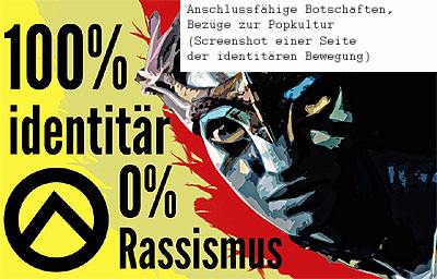 Überhaupt betten die Identitären ihre Botschaften gerne in (populär-) kulturelle Bezüge ein. So sind Motive aus dem Blockbuster „Avatar“ beliebter Bestandteil von Fotomontagen der Identitären. Auch hier wird eine scheinbare Parallele zwischen Filmhandlung und Position der Identitären aufgebaut: Das reine Naturvolk, das sich gegen die feindliche Invasion wehrt. Die Benutzung dieser bekannten und populären Figuren soll die Anschlussfähigkeit der Identitären vergrößern.