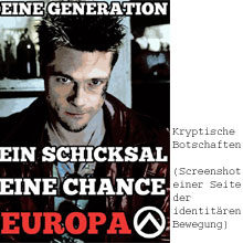 Nun ist die identitäre Bewegung auch in Deutschland angekommen. So stürmten drei mit Guy Fawkes- und Scream-Masken verkleidete Männer die Eröffnungsveranstaltung der „interkulturellen Wochen“ am 30. Oktober in der Frankfurter Zentralbibliothek und wedelten dabei mit Schildern, auf denen „Multikulti Wegbassen“ und „IBD“ stand – die Abkürzung für „Identitäre Bewegung Deutschland“. Gleichzeitig dröhnte Musik aus einem Ghettoblaster. Der skurrile Auftritt ist symptomatisch für die identitäre Bewegung: Aktions- und Partyelemente werden vermengt mit kryptischen Botschaften, bei denen sich der politische Gehalt nicht sofort erschließt. Kein Wunder also, dass selbst einschlägige rechtsextreme Medien noch rätseln, wie das Phänomen zu bewerten sei. Überraschend sind in jedem Fall die Geschwindigkeit und die Professionalität, mit der sich die Bewegung vor allem im Internet ausbreitet. Schon gibt es die ersten T-Shirts und andere „Fanartikel“ mit dem Logo der Bewegung zu bestellen. Dies lässt vermuten, dass ein gut organisiertes Netzwerk dahinter steht, dass den massenhaften Output schon länger vorbereitet hat.