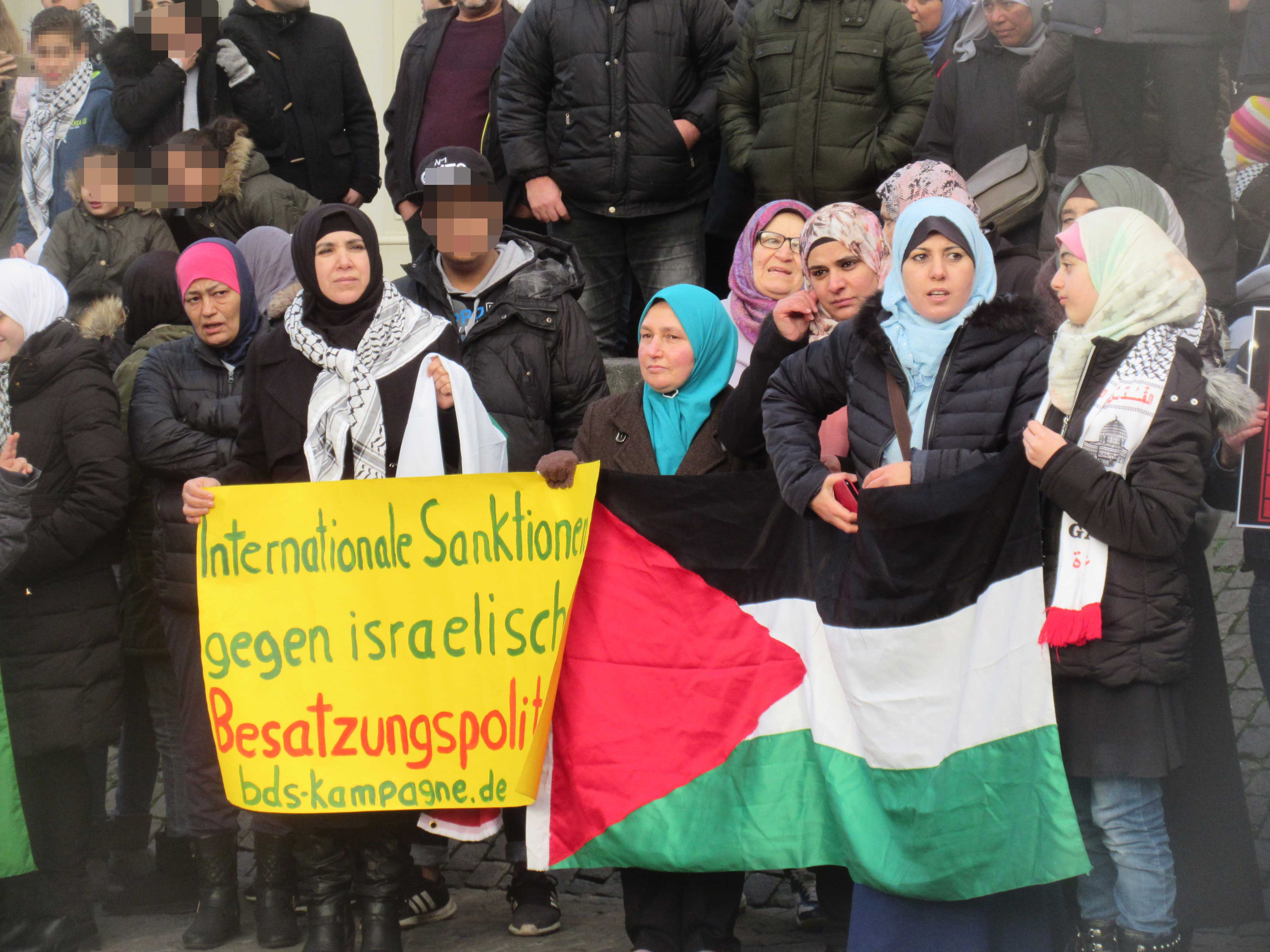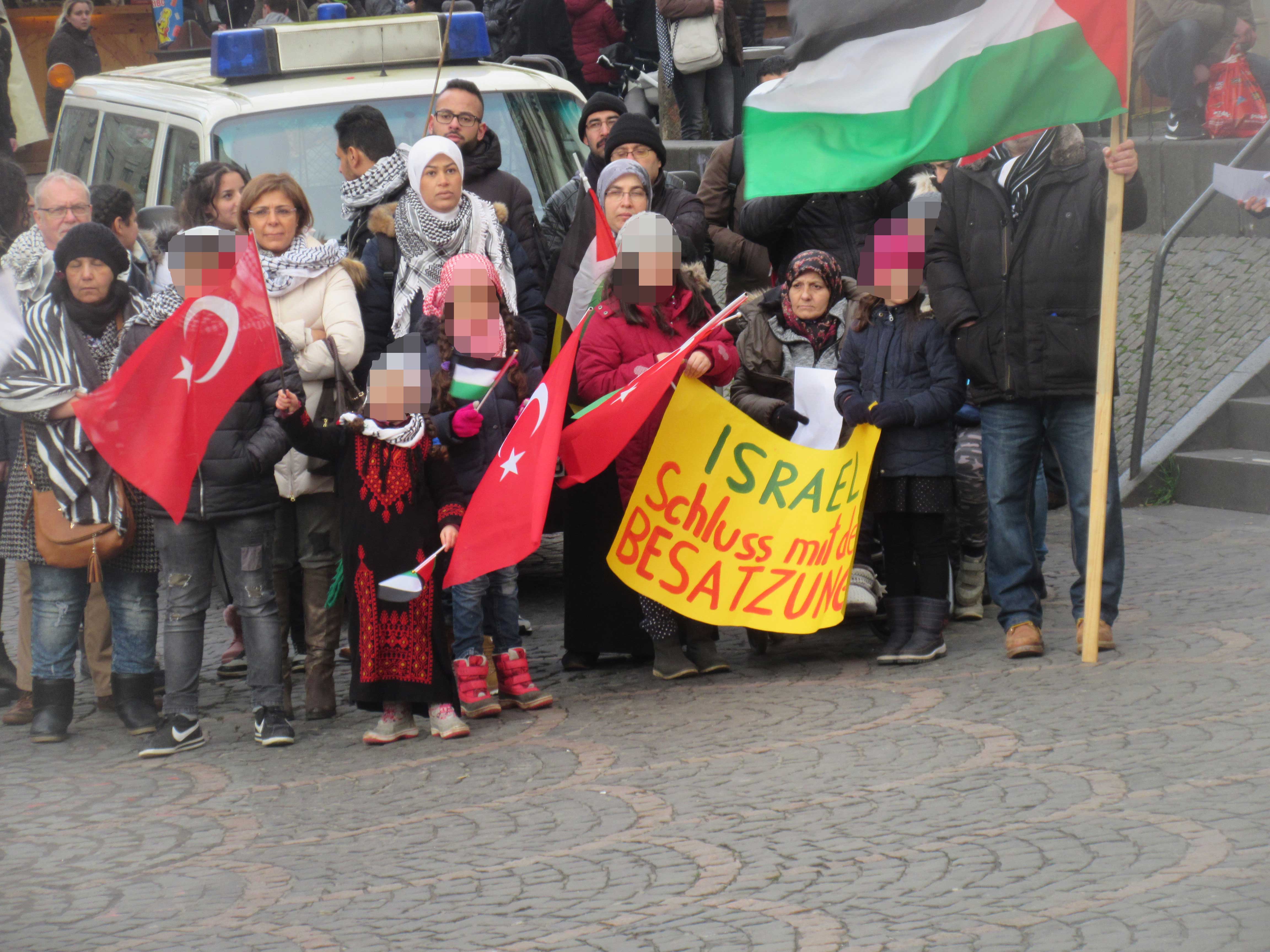 Und im Dezember 2017 versammelten sich zur antisemitischen Mobilisierung knapp 150 Unterstützer der sich stets besonders israelfeindlich gebärdenden Bonner Palästinensischen Gemeinde gemeinsam mit den ewig gleichen „linken“, betagten Bonner antisemitischen BDS-Vertreter in der Bonner Innenstadt, um gegen Israel zu agitieren. Auch zahlreiche türkische Fahnen waren vertreten und zahlreiche Kinder – Bonner Schulkinder! – wurden in die Propaganda gegen Israel und gegen Juden eingebunden und schwenkten entsprechende Hassfahnen. Die proisraelischen Gegendemonstranten hingegen durften nicht in der Bonner Innenstadt auftreten, sie wurden auf eine mehrere Hundert Meter entfernt gelegene Wiese verwiesen.