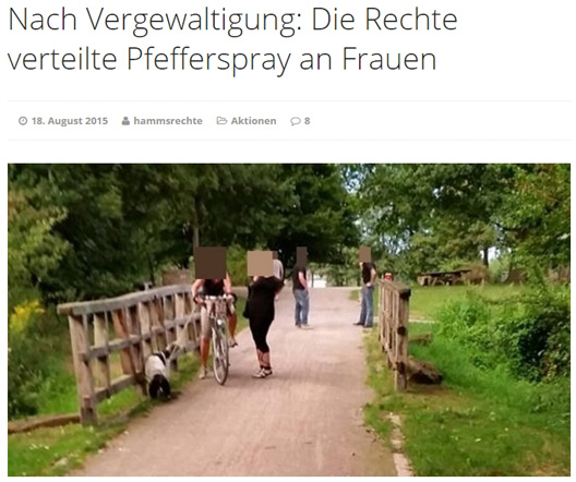 In Nordrhein-Westfalen dient „Die Rechte“ als Ersatzstruktur für verbotene und vom Verbot bedrohte neonazistische Kameradschaftsstrukturen. Die drei umtriebigen Kreisverbände in Dortmund, Hamm und Aachen sind direkt aus diesen Strukturen hervorgegangen – aus dem 2012 verbotenen „Nationalen Widerstand Dortmund“ (NWDO) sowie den ebenfalls aufgelösten Kameradschaften Hamm und Aachener Land. Besonders auskunftsfreudig über lokale Aktionen zeigt sich der Hammer Kreisverband der Partei auf seiner Website. Hier wird bezüglich der Flüchtlingspolitik von „Die Rechte“ erklärt, sie sei die „einzige Partei, die sich für konsequente Rückführungspolitik ausspricht“. Die Hammer Neonazis sehen „in der aktuellen Asylpolitik eine Verdrängung der eigenen Kultur und eine ernsthafte Gefahr für die Sicherheit und das friedliche Zusammenleben in unserer Stadt.“ Und wie begegnen sie dieser vermeintlichen Gefahr? Sie inszenieren sich selbst als Kümmerer: Sie skandalisieren regelmäßig auf ihrer Homepage, wenn die Stadt und der Kreis neue Gebäude als Wohnungen an Flüchtlinge vergeben will, verteilen flüchtlingsfeindliche Flugblätter. Sie mokieren sich in bester Kleingärtnermanier über Lärmbelästigungen. Und sie verteilen Waffen zur Selbstverteidigung.Im vergangenen Sommer nämlich ging der Ortsverband über das übliche Arsenal neonazistischer, flüchtlingsfeindlicher Agitation hinaus. Die Neonazis teilten selbst über ihre Homepage mit: „Wie am Donnerstag, den 13.August 2015 bekannt wurde, vergewaltigten zwei irakische Asylanten aus Hamm eine junge Frau. Leider bedarf es immer wieder erst solcher grausamen Taten, um die Themen ‚Selbstschutz‘ und ‚Selbstverteidigung‘ in das Bewusstsein der breiten Bevölkerung zu tragen.“ Deshalb verteilten „Aktivist_innen“ der Pfefferspray und Flyer in einem öffentlichen Park – nach eigenen Angaben insbesondere an junge Frauen.